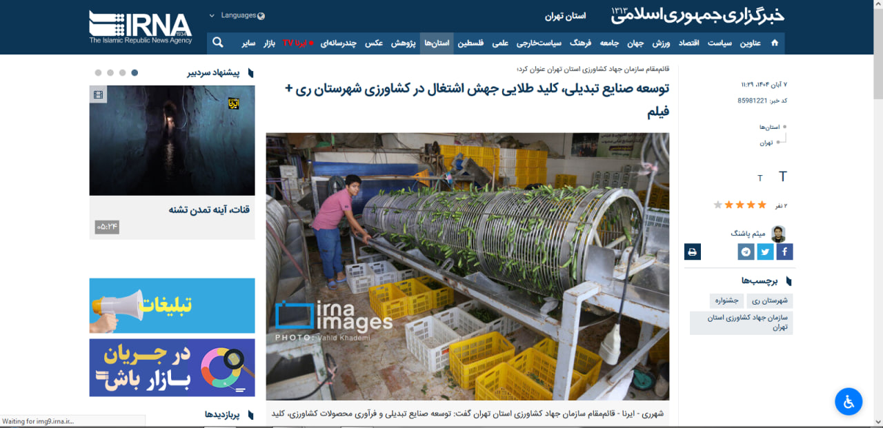 توسعه صنایع تبدیلی، کلید طلایی جهش اشتغال در کشاورزی شهرستان ری