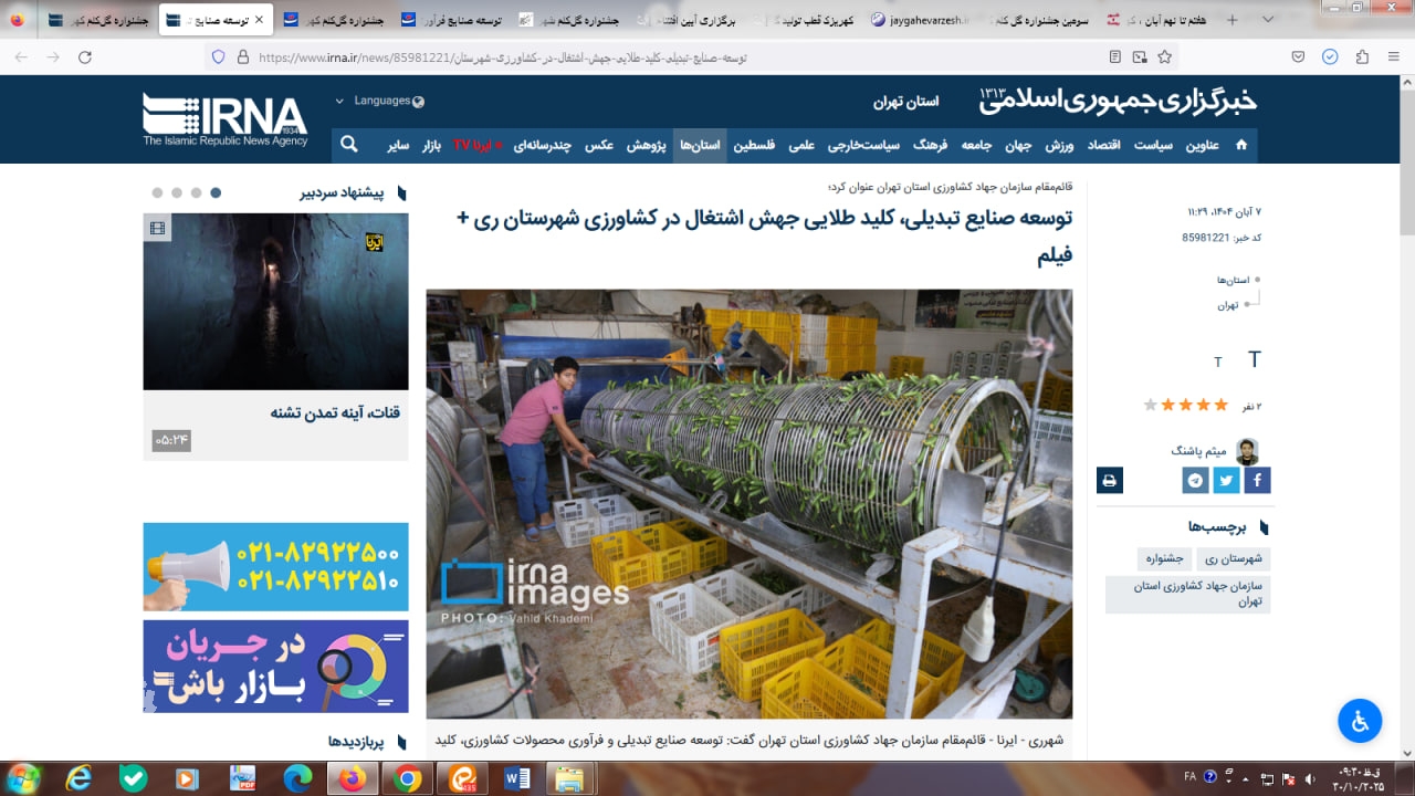 *توسعه صنایع تبدیلی، کلید طلایی جهش اشتغال در کشاورزی شهرستان ری